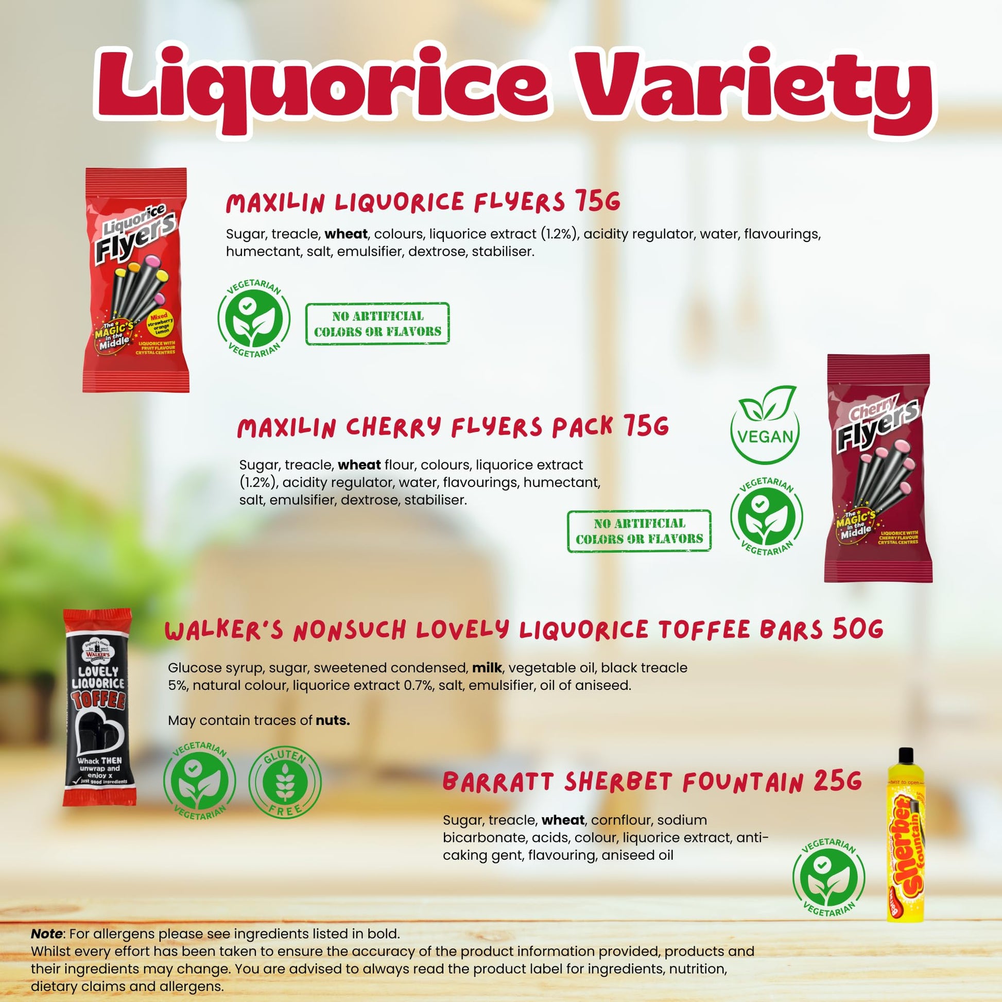 Relish the chewy charm of Haribo Pontefract Cakes and the bold flavor of Walker’s Nonsuch Liquorice Toffee Bars, perfect for those moments when you want to indulge in rich, satisfying textures. For a playful twist, enjoy the magical centers of Maxilin Liquorice Flyers and the tangy surprise in the Cherry Flyers, each bite bursting with fun and flavor. Complete the experience with the retro classic Barratt Sherbet Fountain, a whimsical pairing of fizzy sherbet and liquorice.